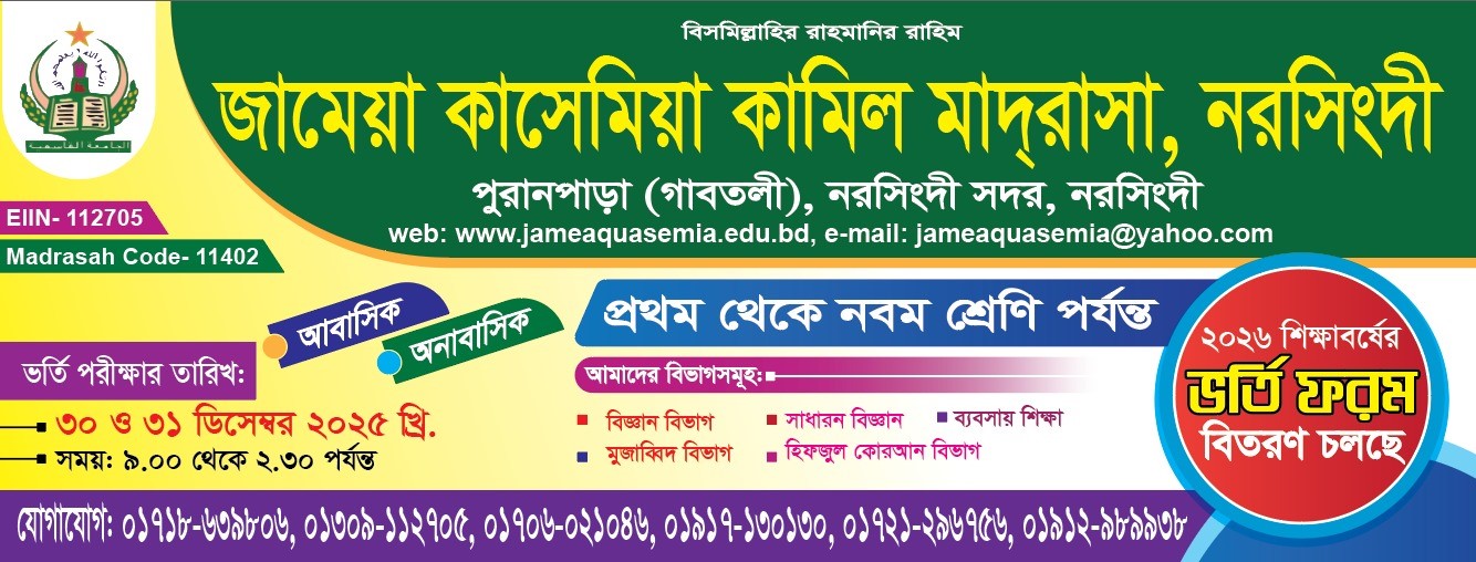আনন্দের সাথে জানানো যাচ্ছে যে, জামেয়া কাসেমিয়া কামিল মাদরাসায় **১ম-৯ম শ্রেণিতে**২০২৬ সেশনে ভর্তি ফরম বিতরণ চলছে। ভর্তি পরীক্ষা ৩০ ও ৩১শে ডিসেম্বর, ২০২৫খ্রি.